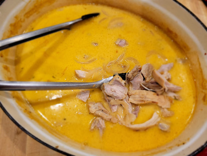 I started by marinating the chicken with my usual recipe but I added fennel fronds (as I am using fennel in this soup). After that I braised the chicken with onions and fennel in white wine, chicken stock, and a touch of cream for body. If you wanted to remove the cream, coconut milk is a good substitute to use. While braising the chicken I used a sachet of spices (sachet d'epice) to keep the smaller spices out of the soup and added some smoked paprika and aleppo pepper for a light earthy bite. That's also the reason to soup has a reddish tinge to it. After the chicken was finished I removed it from the soup so I could shred it and then added the drained, cut up artichokes. Once I had the chicken shredded I added it back to the soup and seasoned it with a touch more lemon juice.