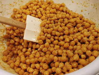 Drain your chickpeas and toss them in garlic oil, salt, pepper, cumin, & curries.