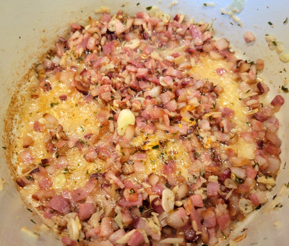 Start by cooking your bacon and garlic in your soup pan on medium heat while stirring. Cook until the bacon has rendered and become crispy. Remove from the pan while keeping the oil in the pan.
