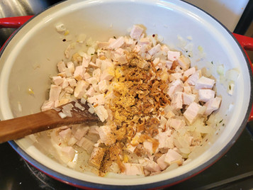 Heat your soup pot and add 2 T of butter until it melts. Add your onions, thyme, turkey, crushed red pepper, mustard powder and your remaining avenue spice. Saute while stirring to soften the onions.